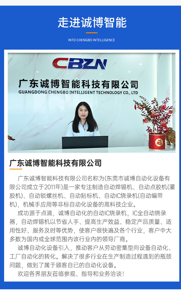 专业制造自动焊锡机、自动锁螺丝机、自动贴标机、自动IC烧录机,自动绕线机等非标自动化设备的高科技企业,公司拥有多年从事研发和生产的人才团队,具有雄厚的产品设计开发能力,也可根据客户要求设计与制造客户自己的自动化设备,提供PLC、触摸屏编程等相关的自动化软件编程服务。