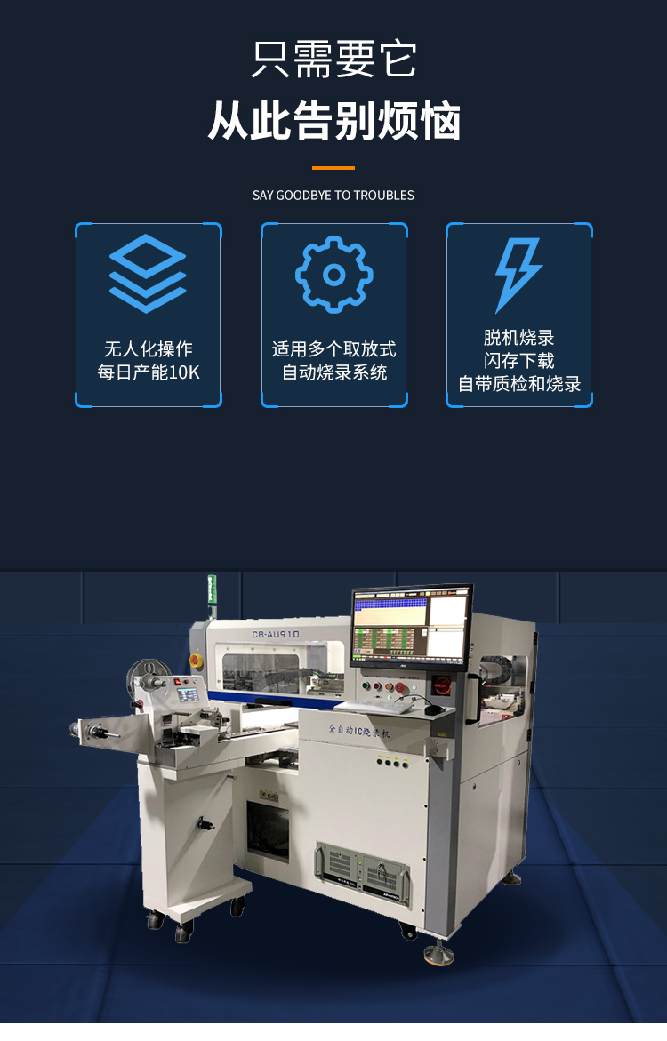 可以烧录三种不同包装的IC,管装,托盘,卷带。可以烧录完成后变换包装方式。具有烧录完成标记功能,可打点,喷码。配备高清CCD两个,定位准确。托盘包装可实现自动上料,收料。有异常状况会自动报警。光学定位系统。所有的零部件采用进口配件。