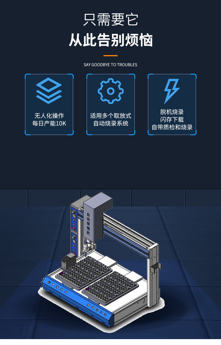专业制造自动焊锡机、自动锁螺丝机、自动贴标机、自动IC烧录机,自动绕线机等非标自动化设备的高科技企业,公司拥有多年从事研发和生产的人才团队,具有雄厚的产品设计开发能力,也可根据客户要求设计与制造客户自己的自动化设备,提供PLC、触摸屏编程等相关的自动化软件编程服务。