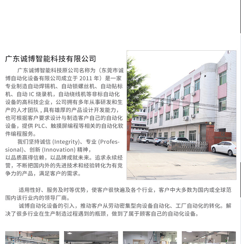 专业制造自动焊锡机、自动锁螺丝机、自动贴标机、自动IC烧录机,自动绕线机等非标自动化设备的高科技企业,公司拥有多年从事研发和生产的人才团队,具有雄厚的产品设计开发能力,也可根据客户要求设计与制造客户自己的自动化设备,提供PLC、触摸屏编程等相关的自动化软件编程服务。